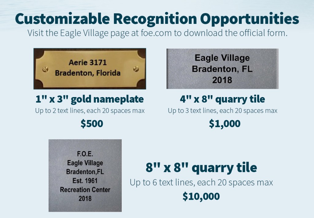 Support Eagle Village by taking advantage of one of the great opportunities listed below and make your Aerie/Auxiliary a permanent fixture at the beautiful new Eagle Village rec center.