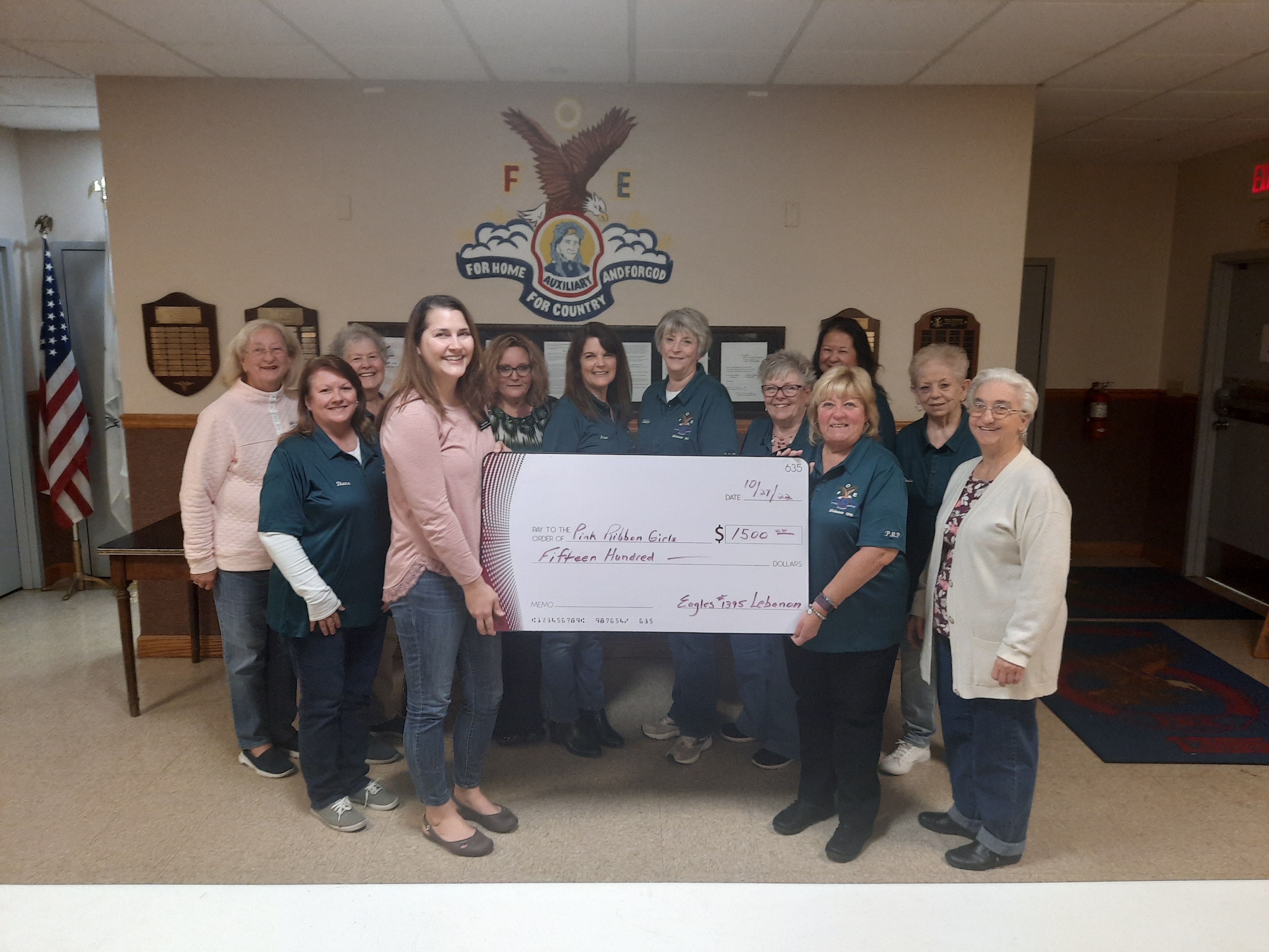 Warren County Eagles #1395 recently donated $1,500 to the Pink Ribbon Girls, an organization which helps breast cancer survivors with transportation to appointments, provides house cleaning services and meal delivery in addition to other support during their recovery.